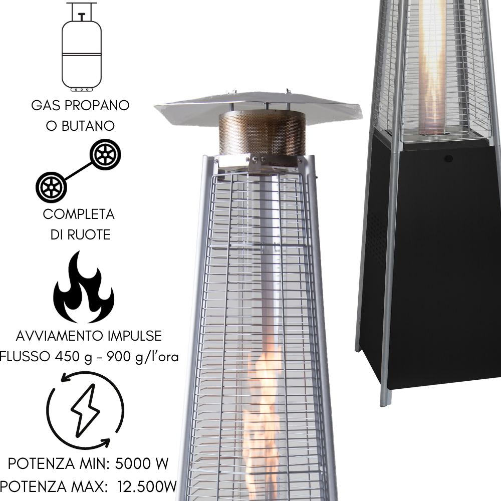 | Caratteristiche: | Pyramid gas stove with wheels, impulse start, maximum power 12.5 kW |