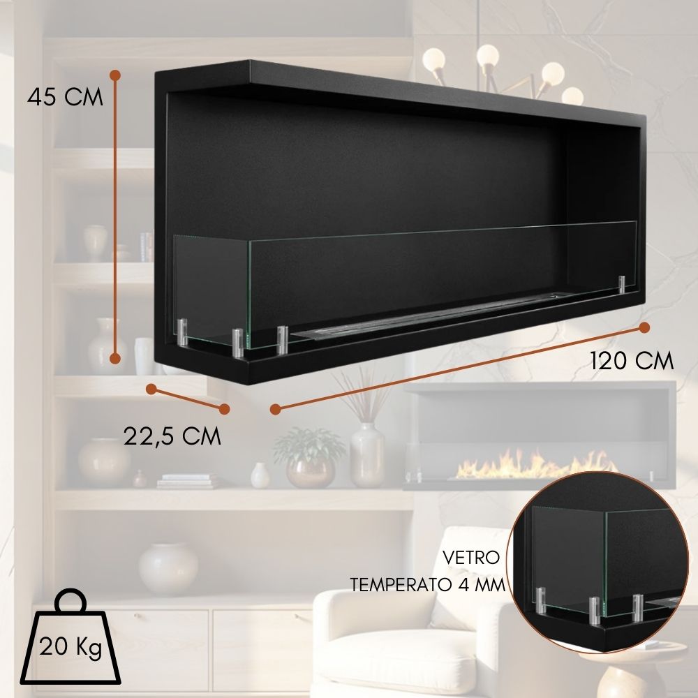 MEASURES: - Biofireplace: 120x22.4x45h cm - Burner: 80x6x5,2h cm - Weight: 20 kg