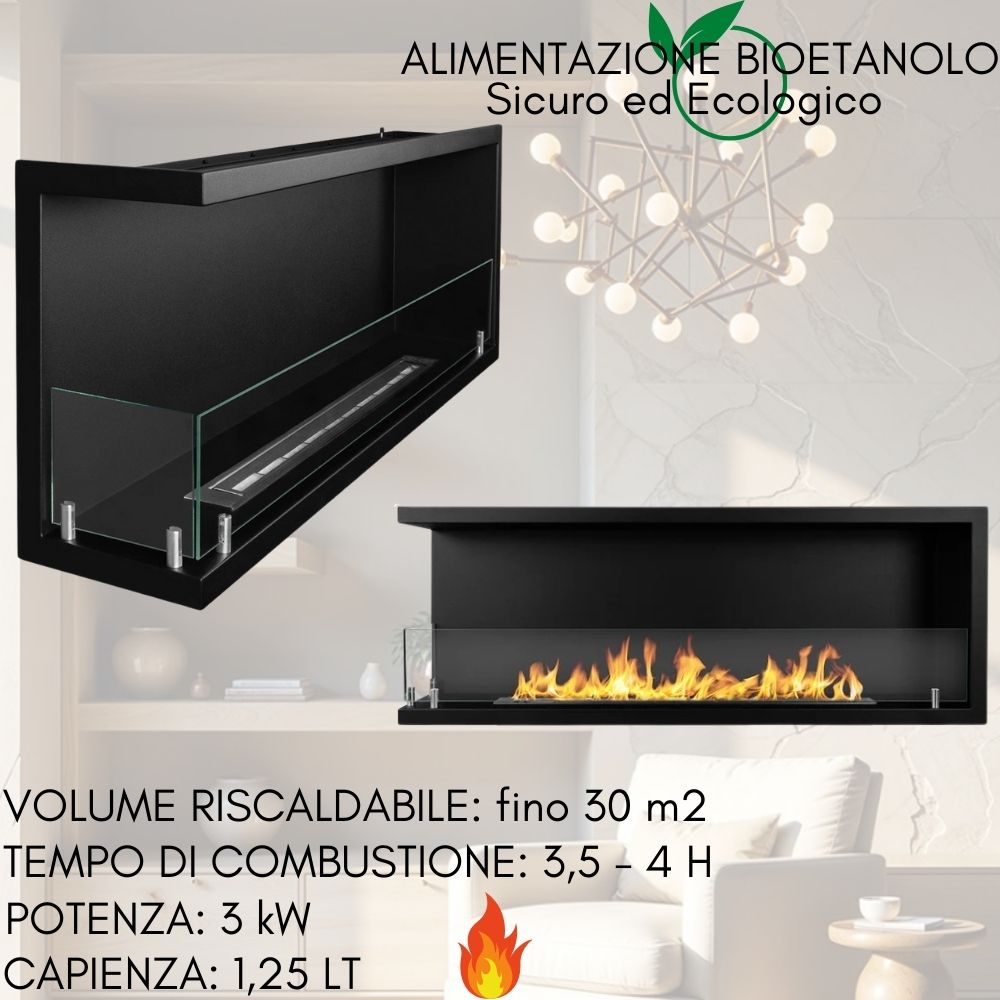 CHARACTERISTICS: - Bioethanol Fireplace - Structure: steel - Burner: steel with rock wool - Capacity: 1.25 lt - Power: 3 kW - Heated surface: up to 30 m2 - Burning time: 3.5-4 h - 4mm tempered glass - Installation: wall-mounted - Fuel: bioethanol - Design: modern - Color: black